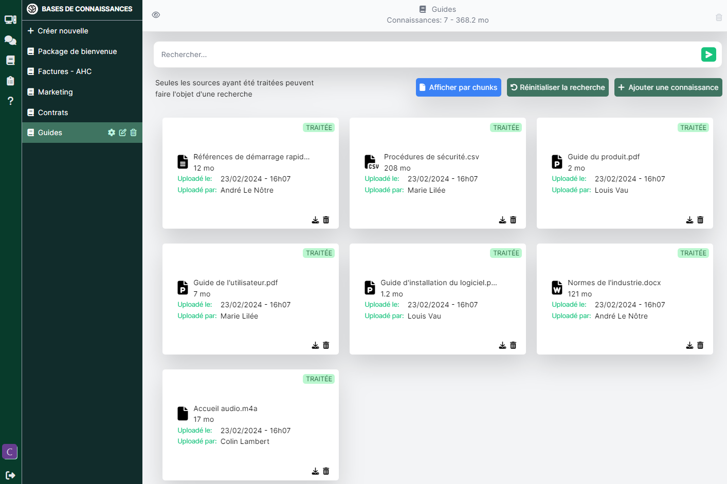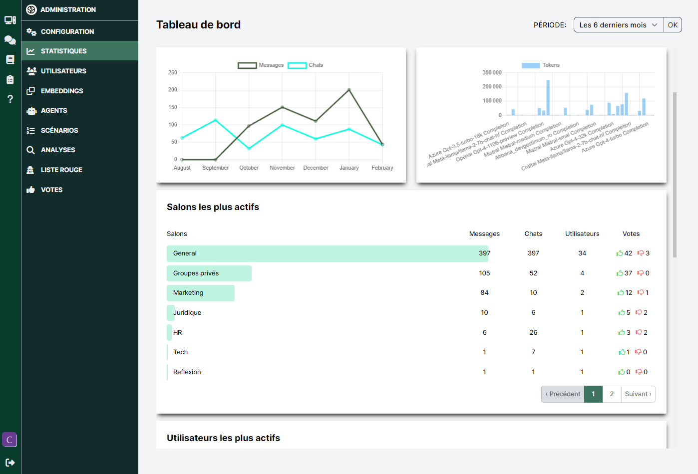 Accédez à des statistiques d'utilisation détaillées, incluant un audit des usages, une analyse poussée des conversations et la collecte de retours utilisateurs.